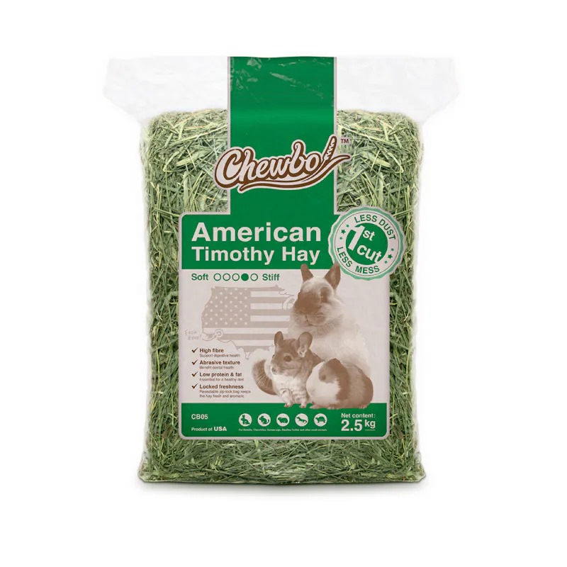 Chewbo 美國一割提摩西草特別經過減塵處理,有效減少粉塵及草碎,保護小動物呼吸道。這款產品亦使用了拉鏈袋包裝,更能保鮮。